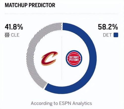 反观活塞上一场击败雷霆,凭借这场胜利,球队以43胜14负的战绩攀升至联盟榜首,本赛季活塞的表现极为强势。他们的进攻效率与防守效率均跻身联盟前十,整体实力均衡且强劲。当家球星坎宁安状态火热,场均能贡献25.4分5.7篮板9.8助攻1.5抢断1盖帽的全面数据,已然跻身一线球星行列。在他的带领下,活塞全队有多达七名球员场均得分上双,阵容深度十足。今天比赛,活塞阵容相对齐整,除斯图尔特因禁赛缺席外,其余球员均可正常出战。美媒ESPN预测本场比赛,活塞胜率57.9%,骑士胜率42.1%。