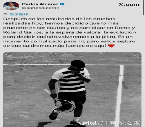 我们首先来关注阿尔卡拉斯。北京时间昨晚,阿卡通过个人社交媒体宣布,他因右手腕伤势未愈,决定退出今年的法网卫冕战。 “在今天进行的检查结果之后,我们决定最稳妥的做法是保持谨慎,不参加罗马大师赛和罗兰-加洛斯的赛事,等待评估进展后再决定何时重返赛场。这对我来说是个艰难的时刻,但我相信我们会从中变得更加强大。”